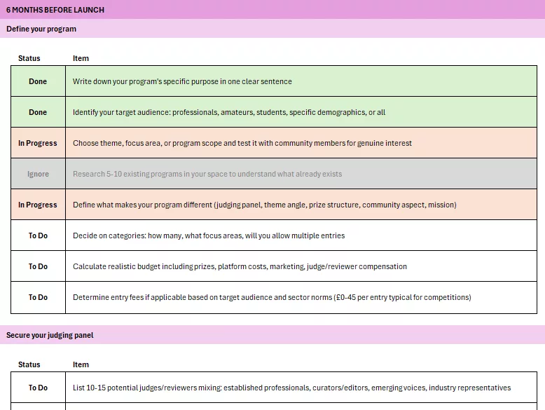 This checklist provides the process framework that works for all competition types. Our [sector-specific guides] provide detailed context for photography, art, corporate awards, and other specific sectors. Use both together for best results.