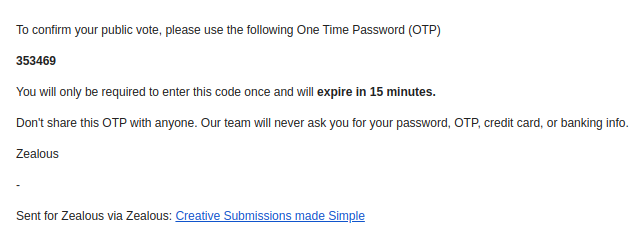 If they are logged in to a Zealous account, the vote will go through instantly. If they do not have an account, they will be asked to verify their vote by entering an OTP (One time Password) that they will receive via email. Each person can vote more than once, but only once per entry.